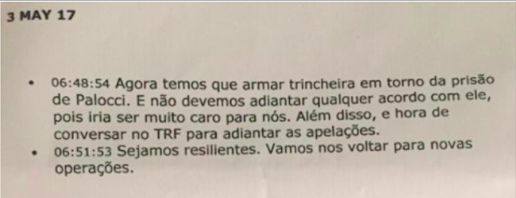 “Agora temos que armar trincheira em torno da prisão de Palocci. E não devemos adiantar qualquer acordo com ele, pois iria ser muito caro para nós. Além disso, é hora de conversar no TRF para adiantar as apelações”.