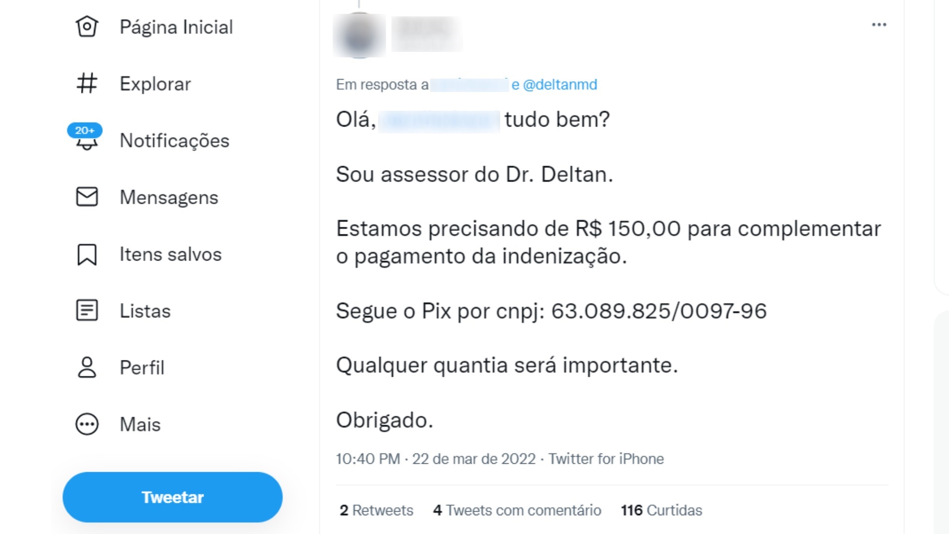 Outro declara que já fez sua doação: “Já depositei minha parte em prol do grande Deltan! Sugiro que todos os apoiadores façam o mesmo”. Entusiasmado, um usuário também confirma: “Valor enviado! Vamos superar!”. Mais um internauta mostra que caiu no conto do vigário: “Tá feito o PIX! Confirma pra mim!”