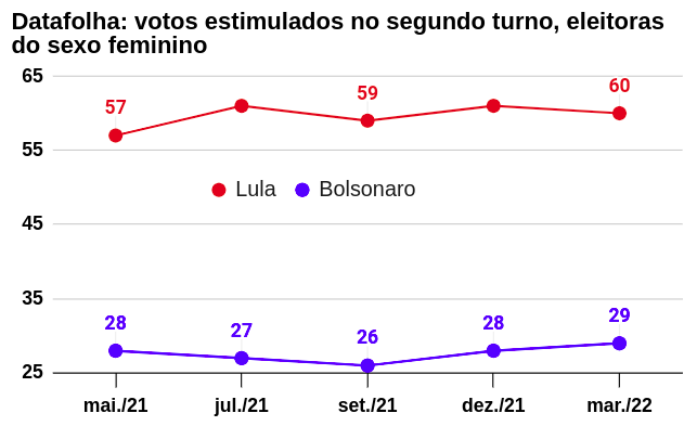 No histórico do simulado para Lula e Bolsonaro no segundo turno, o petista manteve, nas cinco últimas pesquisas, uma distância em torno de 30 pontos, sem grande variações. Se a eleição fosse hoje, 60% das mulheres votariam em Lula e somente 29% votariam em Bolsonaro no segundo turno.