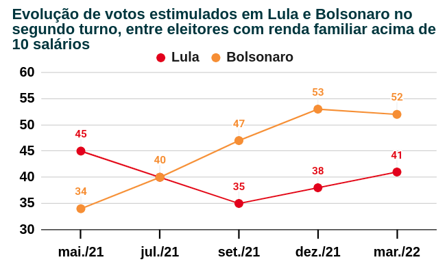 Entre quem ganha mais de 10 salários, Bolsonaro ganha, com vantagem de 11 pontos, mas o petista vem crescendo nos simulados de segundo turno. Lula tinha caído para 35% em setembro, subiu para 38% em dezembro, e hoje tem 41% nesse extrato mais rico.