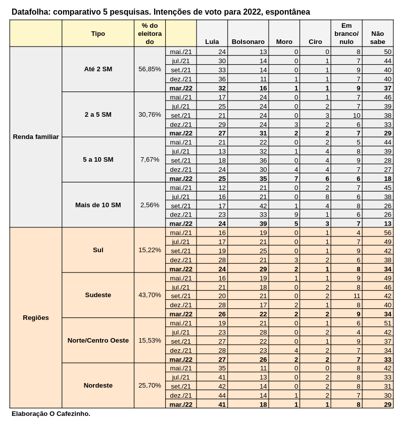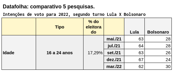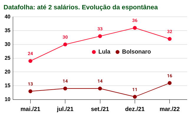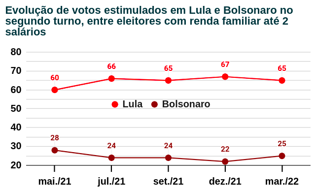 É exatamente junto a esse extrato, de eleitores com renda familiar até 2 salários, que Lula vem mantendo a maior vantagem sobre Bolsonaro. No histórico das últimas cinco pesquisas do Datafolha, o petista fica mais de 40 pontos à frente do capitão. Nessa última pesquisa, o placar foi de 65% a 25%.