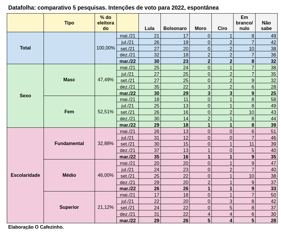 O mesmo segmento, quando observado no histórico da pesquisa espontânea, também apresenta liderança firme de Lula. Bolsonaro cresceu para 16%, mas nada muito longe dos 14% que tinha em setembro do ano passado. Lula, por sua, tem o dobro disso: 32%.