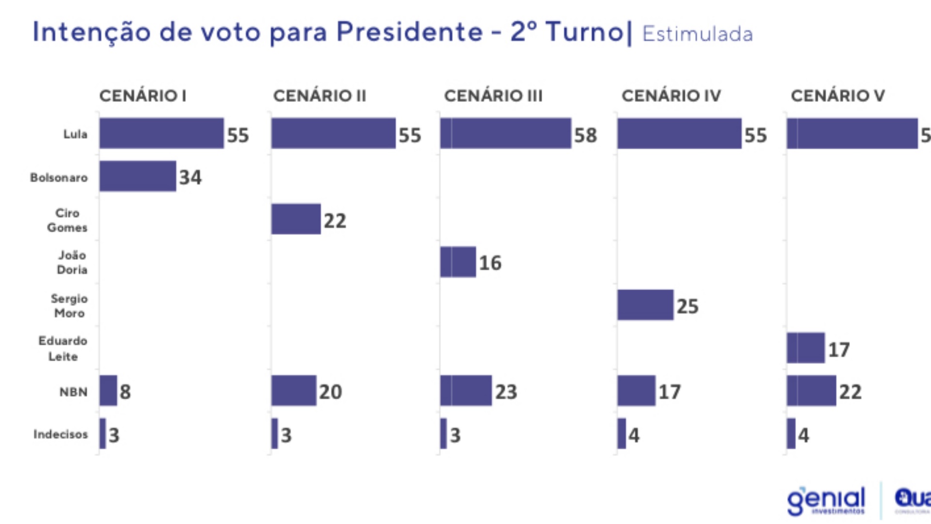 Mesmo com a desistência de Moro e transferência de votos para Bolsonaro, Lula venceria a disputa no primeiro turno, com 51,1% dos votos válidos no principal cenário estimulado. Entre todos os cenários pesquisados, o petista varia de 44% a 46% e Bolsonaro entre 29% e 31%.