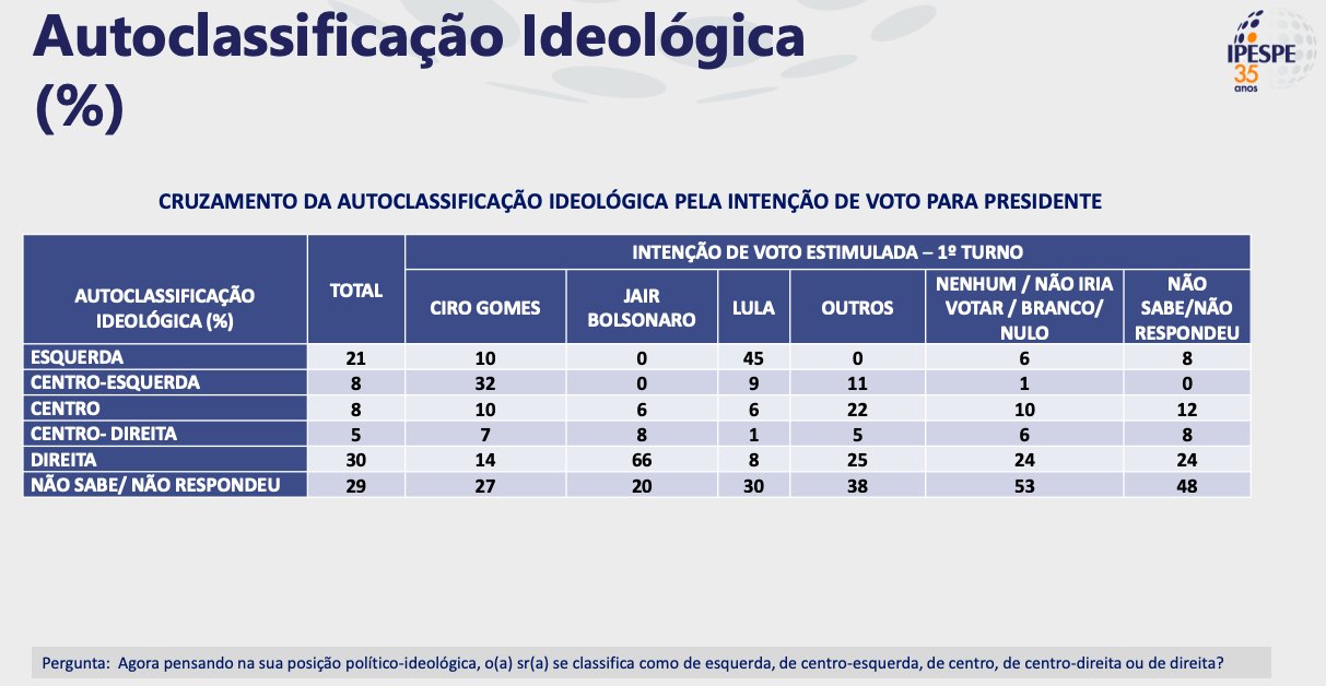 O ex-ministro Ciro Gomes (PDT) continua em terceiro lugar com 8% das intenções de votos. João Doria (PSDB) vem na sequência com apenas 3%, empatado tecnicamente com André Janones (Avante) e Simone Tebet (MDB), que possuem 2% e 1%, respectivamente. O restante não pontuou.