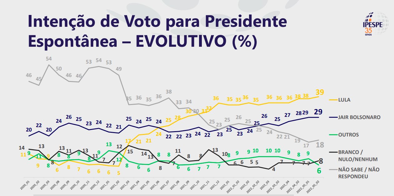 De acordo com dados do relatório, o atual chefe do executivo federal saiu dos 31% e foi para 32%. Já o petista manteve os 44% em comparação com o levantamento anterior. Isso significa que a diferença entre o primeiro e o segundo colocado é de 12 pontos percentuais.