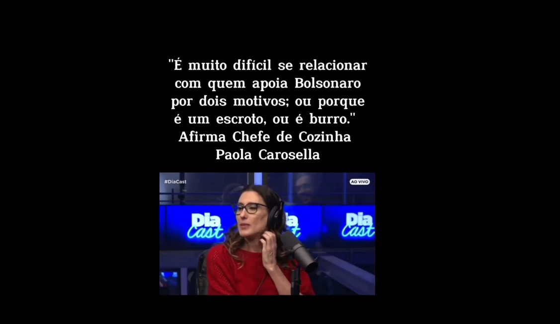 Paola Carosella participou do podcast “DiaCast” e detonou quem é apoiador do presidente Jair Bolsonaro (PL). Na opinião da chef de cozinha, é muito complicado conviver com um bolsonarista, porque ela os considera pessoas mal educadas ou sem inteligência.