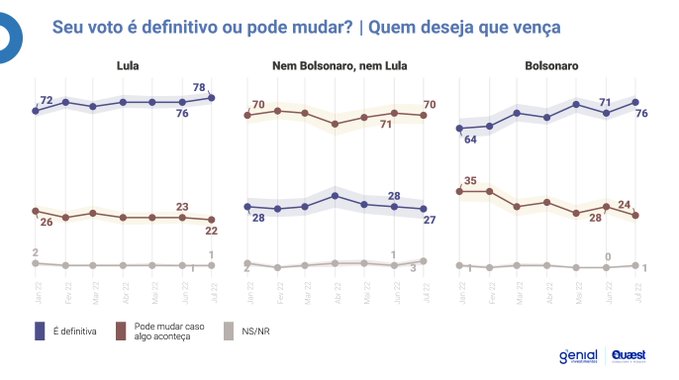 A polarização parece bem consolidada se avaliamos os índices de decisão de voto, que chegam a 78% entre eleitores de Lula e a 76% entre eleitores de Bolsonaro.