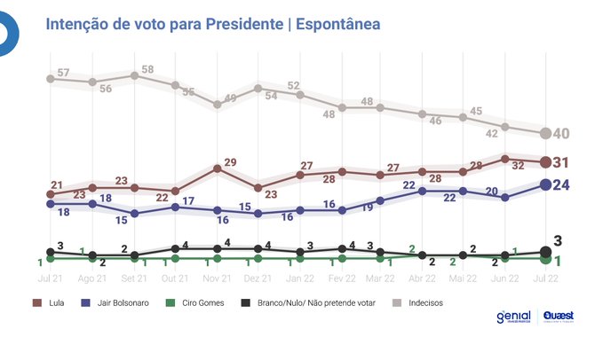 Completamos um ano de pesquisa Genial/Quaest! Esta rodada mostra que a polarização está muito consolidada, com a distância entre eles menor do que no último mês. Em voto espontâneo, Lula tem 31% das intenções de voto e Bolsonaro 24%. Indecisos somam 40%.