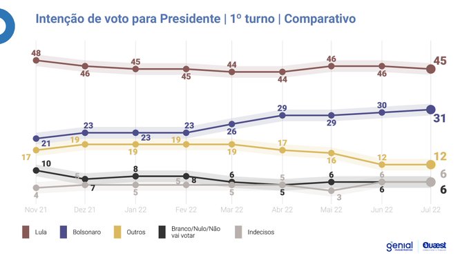 No voto estimulado, a distância entre Lula e Bolsonaro também diminuiu: passou de 16 para 14 pontos. Lula aparece com 45% das intenções de voto, Bolsonaro 31%. Os demais candidatos somam 12%. Com esses números, não é possível afirmar se a eleição será definida no 1º turno.
