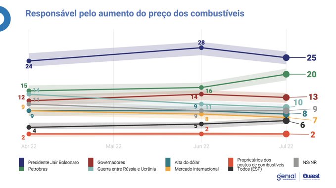 Por exemplo, caiu o percentual de eleitores que responsabilizam Bolsonaro pelo aumento do preço dos combustíveis (de 28 para 25%). Ele conseguiu terceirizar parte da responsabilidade para a Petrobras (de 16% para 20%).