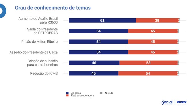 60% sabem que o presidente está tentando aumentar o Auxílio para R$ 600, 54% que ele brigou para forçar a saída do presidente da Petrobras, 46% que ele está tentando criar subsídios para as categorias de transporte e 45% que ele está forçando a redução do ICMS dos estados.