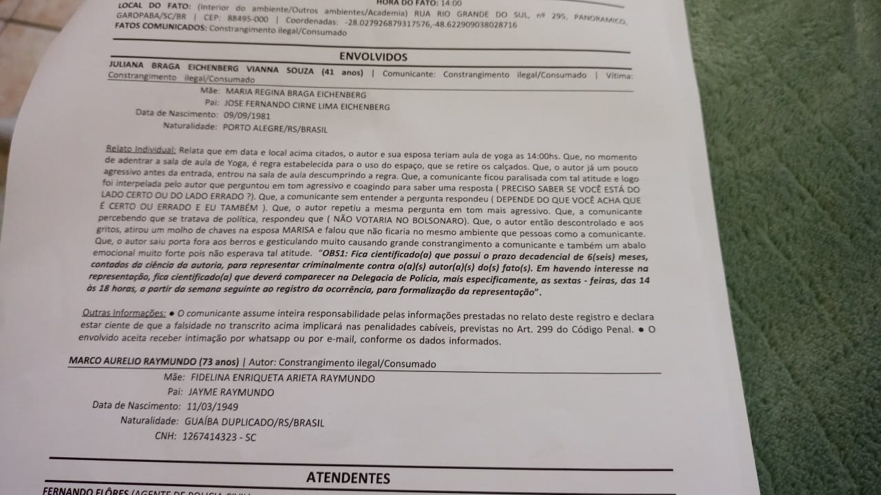 Juliana afirma que chamou a atenção do cliente, que a afrontou em seguida. “Foi interpelada pelo autor, que questionou em tom agressivo: ‘Preciso saber se você está do lado certo ou errado'”, diz o boletim, registrado na Delegacia de Polícia Civil de Garopaba.