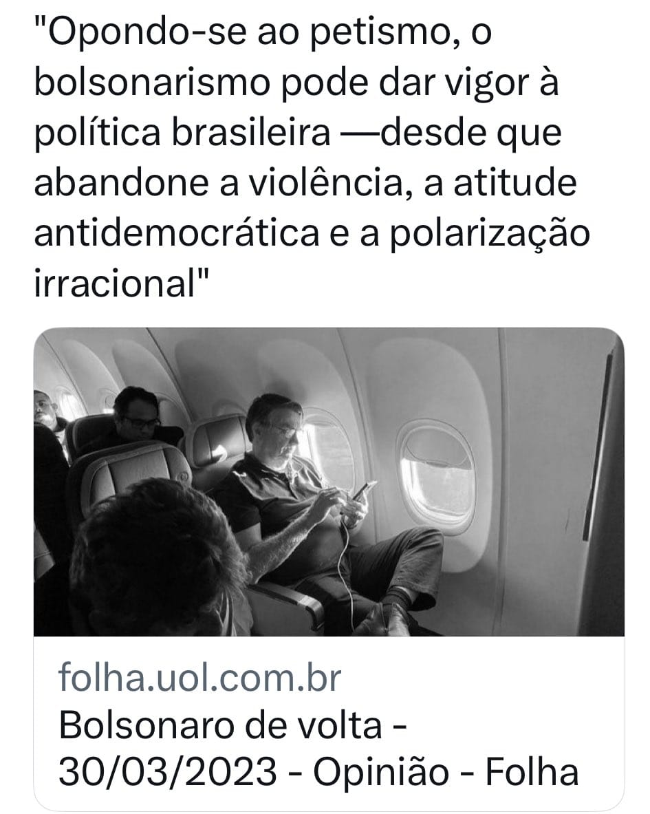 Há pouco, alguém percebeu a bandeira no editorial e mudou o desfecho online: “O bolsonarismo até poderia, se abandonasse a violência e o autoritarismo, liderar uma oposição saudável ao PT. Esse não é, infelizmente, o desfecho mais provável”.