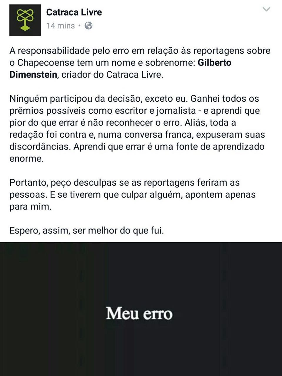 Não me lembro de ter visto, em minha carreira, uma nota de desculpa tão infeliz quanto a escrita por Gilberto Dimenstein para justificar a conduta do seu site Catraca Livre no caso Chapecoense.