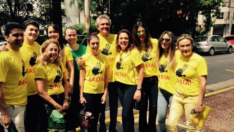 No dia do protesto antiDilma, o senador do DEM por Goiás apareceu na Avenida Paulista com uma camiseta amarela com o slogan “Basta!” e a estampa de uma mão esquerda com quatro dedos suja de petróleo.