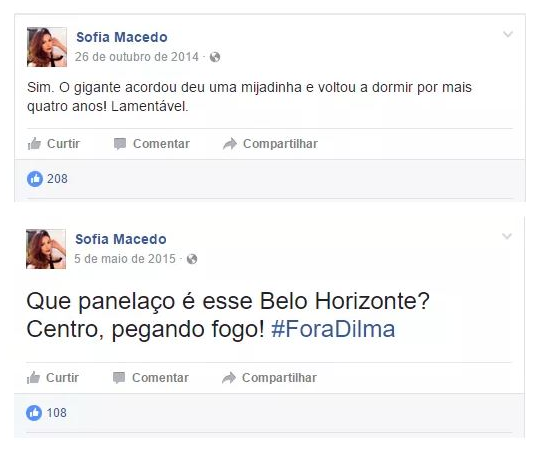 De resto, seus posts são relacionados a maquiagem (que faz em si mesma). Muito bonita, agora tem a página recheada de comentários como ‘bonitinha mas ordinária’, ‘vai ser bonita assim lá na cadeia’, ‘olha a corrupta’. Enfim, Sofia se assemelha ao despolitizado clássico que apenas repete o que seu meio social propaga sem refletir.