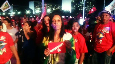 Abusa dessa tática. Em sua página, postou uma foto na manifestação contra o golpe em Brasilia no dia 18. No meio das camisetas vermelhas, lá está a canalha com seu uniforme e um cartazete escrito “Impeachment Já”.