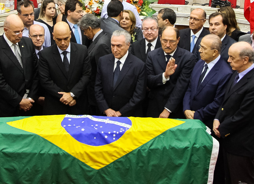 José Serra dando risada e a gangue de Temer reunida em torno do caixão no velório de Teori Zavascki.