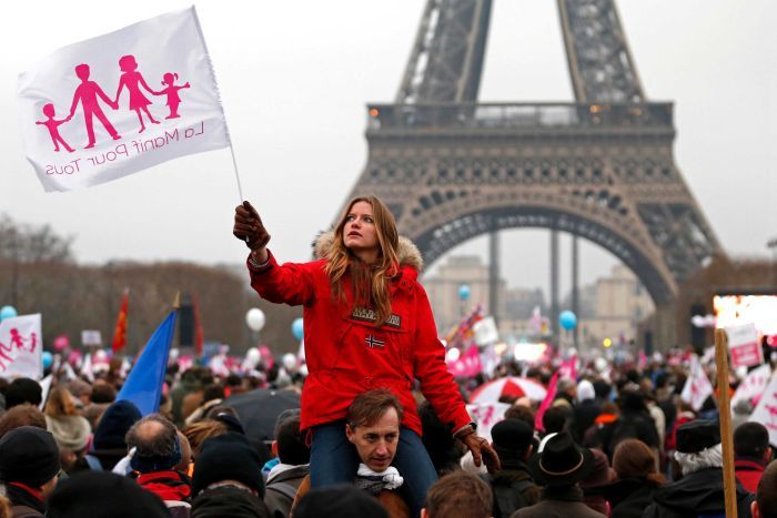O país está em efervescência, desde que o governo apresentou esse projeto de lei. Em Paris e também no resto do país, os defensores da família tradicional organizam-se. A legalização da adoção de crianças por casais gays é particularmente atacada. Nos cartazes nos protestos, pode ler-se: “Papa + Maman, y a pas mieux pour un enfant” [Papai + mamãe, não há melhor para a criança].