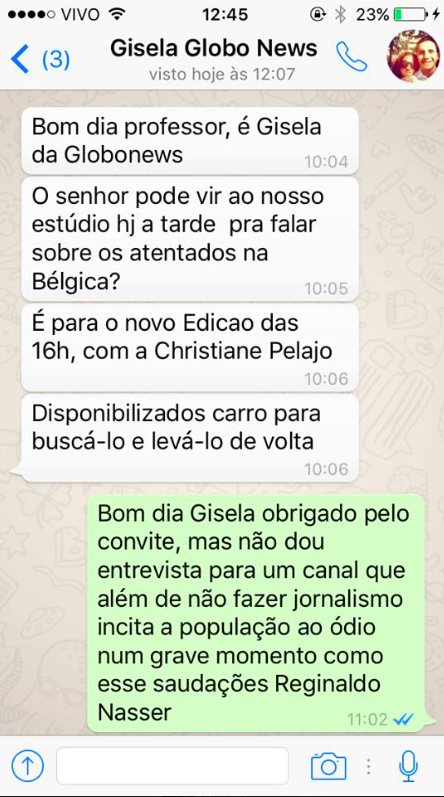 Nasser publicou o convite e sua negativa no Facebook. Pelo WhatsApp, a produtora lhe perguntou se ele poderia ir aos estúdios falar dos atentados na Bélgica.