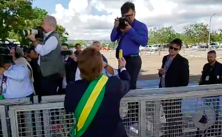 Ele saiu de um carro junto com o chefe da Secom, Fabio Wajngarten, e tocou uma corneta.