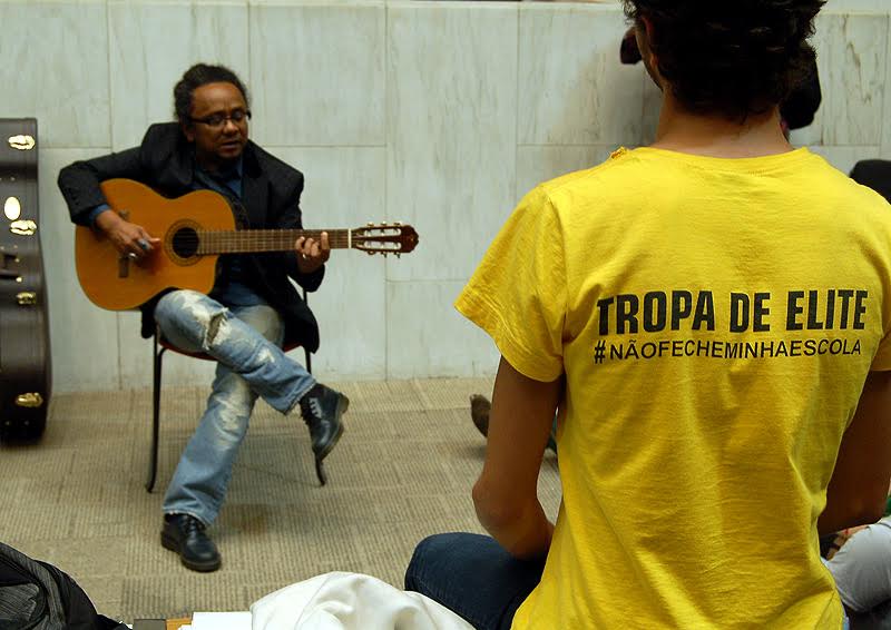 Já passava da meia-noite quando Chico César empunhou o violão e cantou no plenário da Assembleia Legislativa de São Paulo (ALESP). O cantor foi levar seu apoio aos estudantes que resolveram ocupar a ‘casa do povo’ no final da tarde de ontem e que ali prometem ficar até que seja aberta uma CPI para investigar desvios de dinheiro na máfia da merenda.