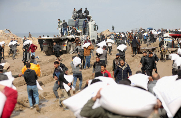 Palestinos carregam sacos de farinha distribuídos em Gaza. Foto: Kosay Al Nemer/Reuters
