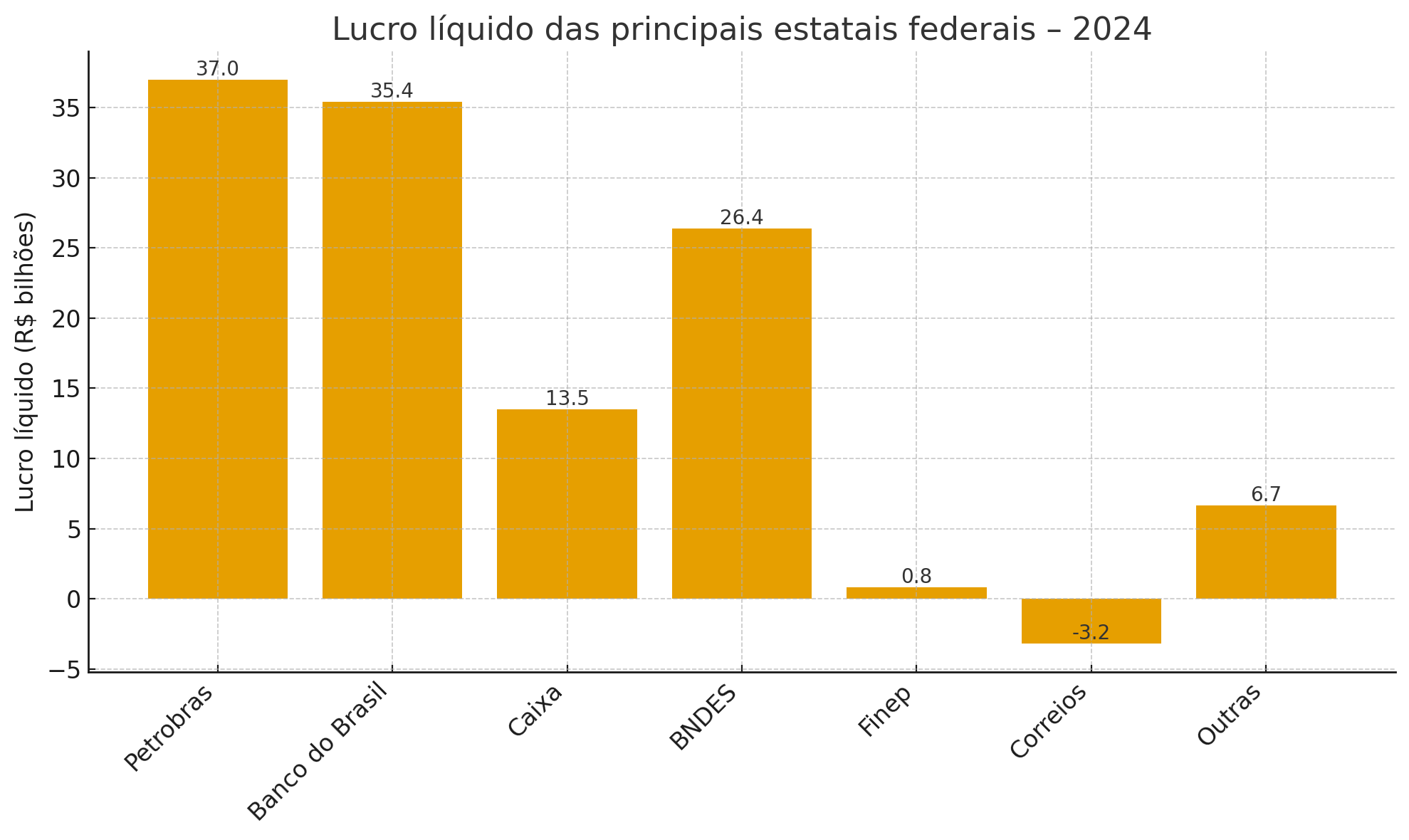 Segundo o Relatório Agregado das Empresas Estatais Federais 2025, ano-base 2024, as 44 empresas estatais de controle direto registraram lucro líquido de 116,6 bilhões de reais. Realizaram 96 bilhões de reais em investimentos. Faturaram 1,3 trilhão de reais. E pagaram 152,5 bilhões de reais em dividendos e juros sobre capital próprio, dos quais 72,1 bilhões foram diretamente para a União.