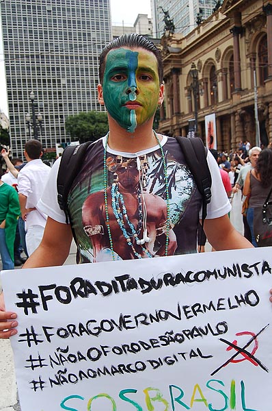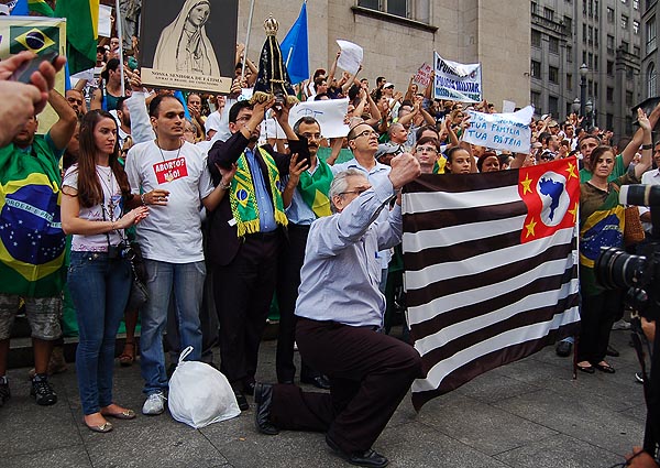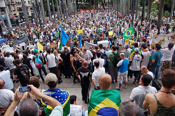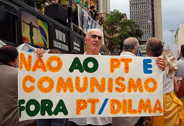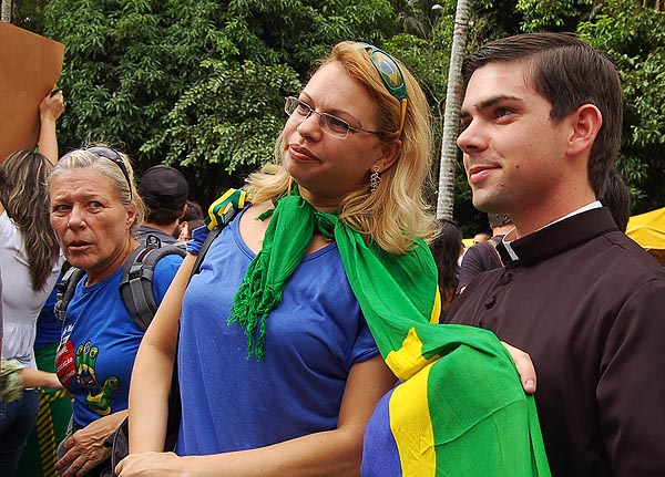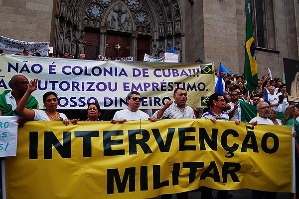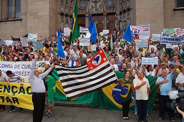 Senhoras, senhores, representantes da maçonaria, da igreja católica, skinheads e integralistas. Caras pintadas e roupas verde-amarelas. Discursos inflamados a respeito da existência de um grande complô comunista em andamento. Faixas em apoio à manutenção da militarização das polícias. Hino nacional na concentração e durante todo o trajeto.