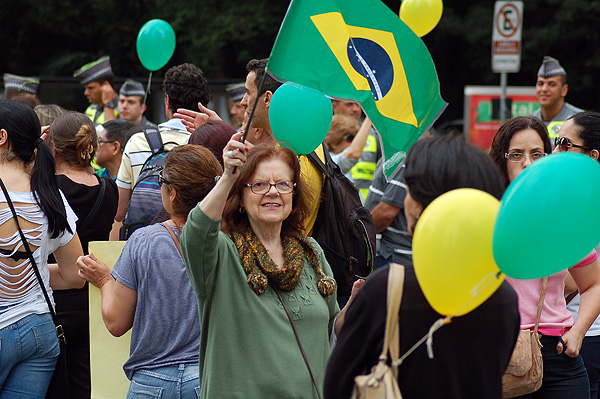 A faixa que puxaria a procissão continha os temas ‘não ao Marco Civil’, ‘não às cotas raciais’, ‘não à reforma política’, ‘liberdade de imprensa’. As cartolinas escritas à mão pediam ‘fora Dilma’, ‘impeachment já’, ‘façam o diabo com Cuba, não com o Brasil’.