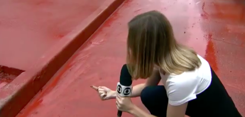 Na foto que abre essa matéria (registrada um dia antes da reportagem da TV) é possível perceber que o que é vermelho é o próprio concreto. Perceba ainda, ao fundo, parte dele coberta com um plástico, justamente para evitar que a chuva o estragasse. Provavelmente, no dia seguinte o concreto já estivesse em processo de “cura”, não necessitando mais do plástico. Mas como sempre sobra material em forma de pó na superfície ou nas laterais, fora da área da laje, a chuva (que não foi pouca) dispersou esse pó.