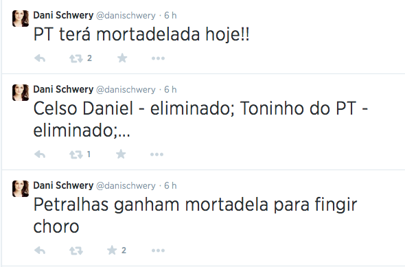 Ela habita um terreno pantanoso entre o deboche, a fraude e a psicopatia. Schwery conseguiu forjar um meme de Dilma Bolada (“Pra descer todo santos ajuda”) e então se pôs a despejar uma série de acusações. “PT em festa”; “Celso Daniel eliminado; Toninho do PT eliminado…”. (Aliás, Dilma Bolada, perfil criado pelo publicitário Jefferson Monteiro, também fez uma piada doentia com Aécio e o menino que teve o braço decepado por um tigre no Paraná).