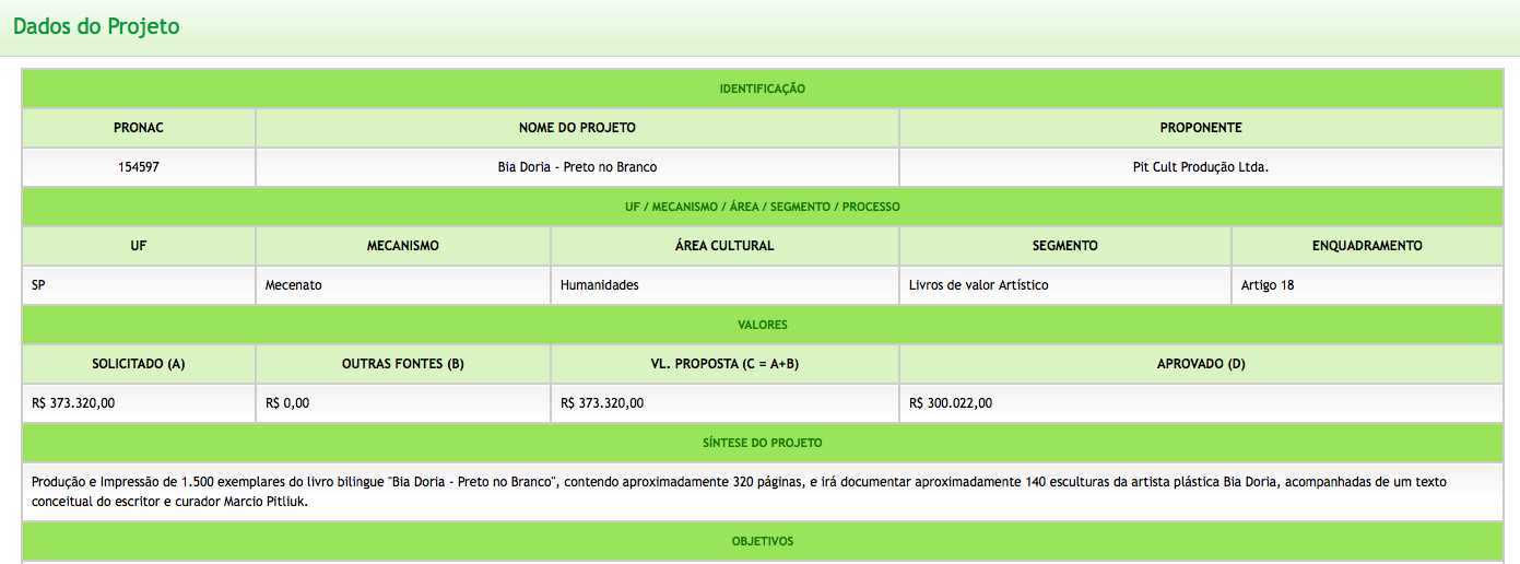 Um outro projeto, chamado “Preto no Branco”, solicitava 373 320 reais. Trata-se de um “livro bilingue, contendo aproximadamente 320 páginas”, com 140 esculturas da artista plástica Bia Doria, acompanhadas de um texto conceitual (!?) do escritor e curador Marcio Pitliuk.