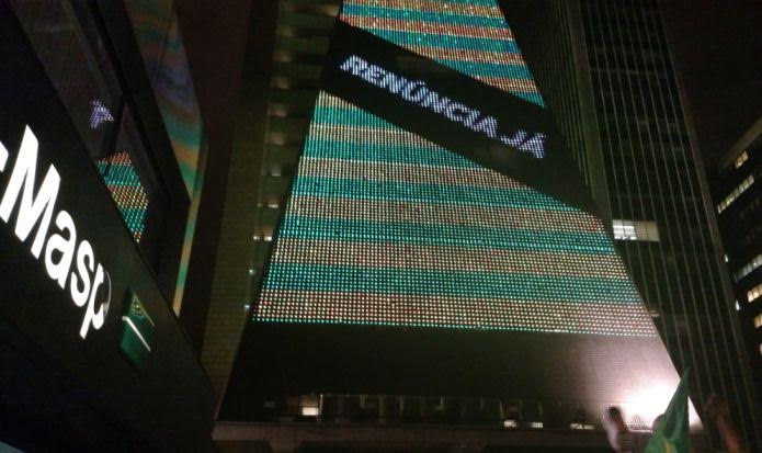 Na projeção digital no edifício da Federação das Indústrias do Estado de São Paulo a frase “renúncia já” aparecia numa faixa preta sobre as cores verde e amarela.
