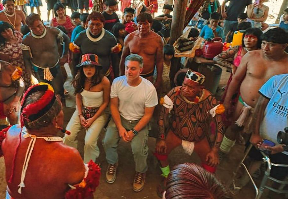 O apresentador Luciano Huck ao lado da cantora Anitta em durante gravação com indígenas no Xingu, no Mato Groso. Foto: Reprodução/Instagram