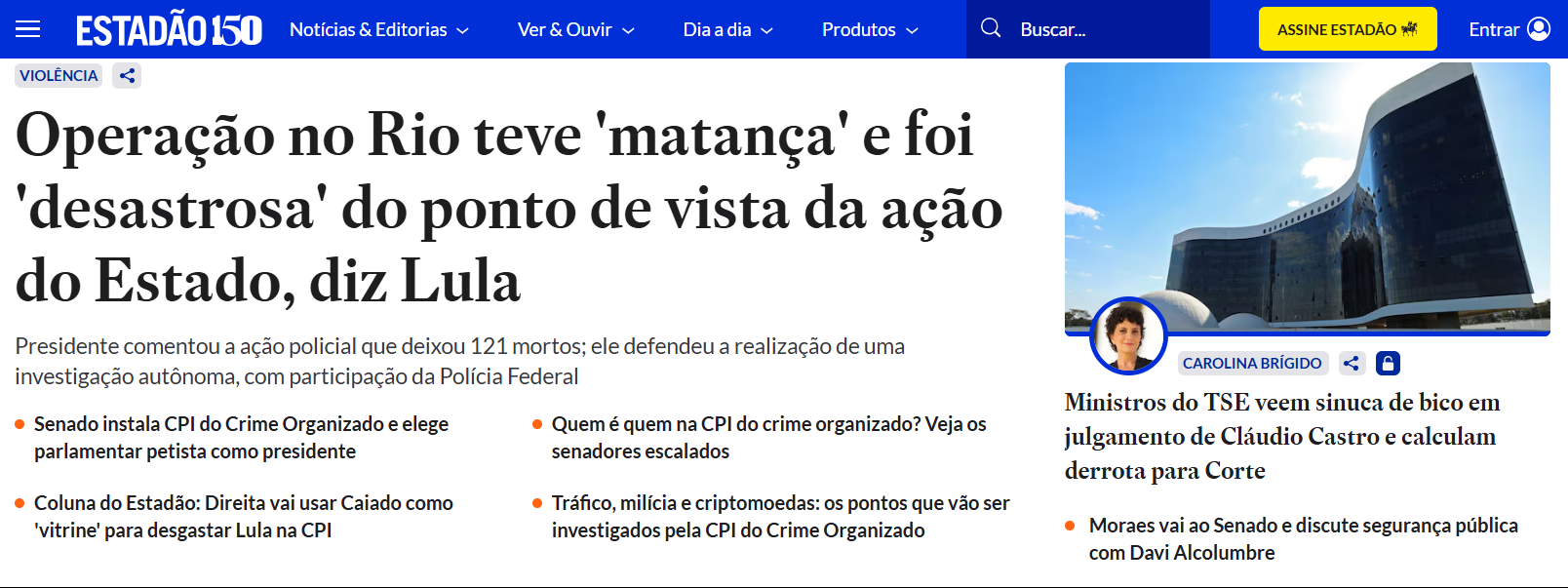 O Estadão se nega a publicar na capa a palavra matança, usada hoje por Lula para definir o que aconteceu no Rio.