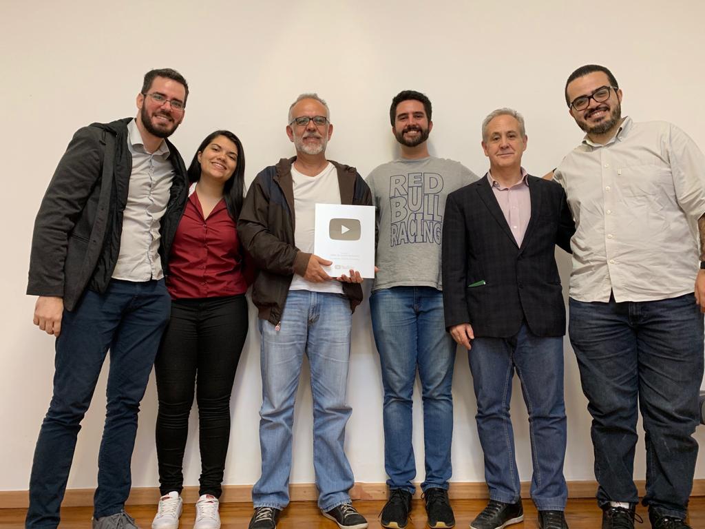 Alessandro, Bruna, Kiko, Felipe, Joaquim e Pedro com a placa do YouTube