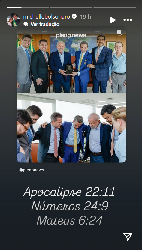 Nos Stories de seu perfil no Instagram, Michelle compartilhou a imagem da reunião e incluiu três referências bíblicas: “Apocalipse 22:11, Números 24:9, Mateus 6:24”. O versículo de Mateus, usado com frequência por religiosos, afirma que “ninguém pode servir a dois senhores, pois amará um e odiará o outro, ou será fiel a um e desprezará o outro”.