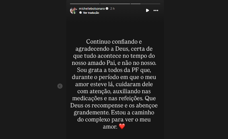 Ao final da postagem, Michelle Bolsonaro informou que se deslocava para o local onde Jair Bolsonaro passaria a cumprir a nova etapa da custódia. “Estou a caminho do complexo para ver o meu amor”, escreveu, encerrando a mensagem com um emoji de coração.