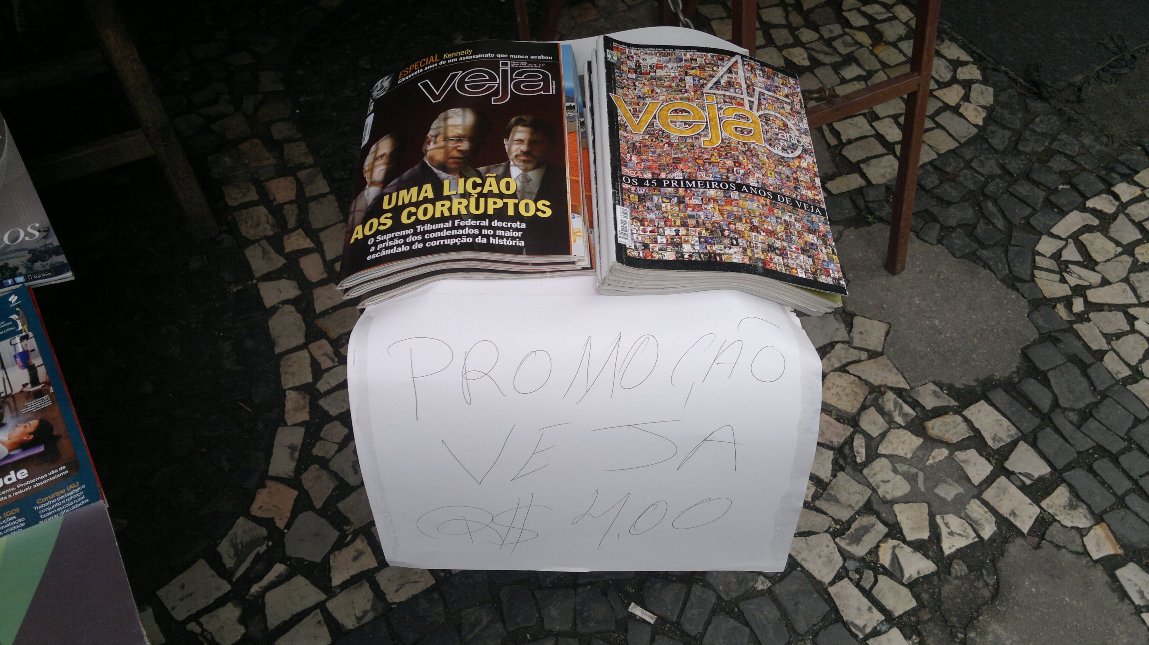A Veja, ignorada pelo público, estava sendo vendida ao chamado preço de banana numa banca no Largo da Carioca, no centro do Rio. Importante: não no meio ou no final da semana, quando está chegando uma nova edição. No começo, quando a revista está tão quente quanto poderia estar no mundo digital.