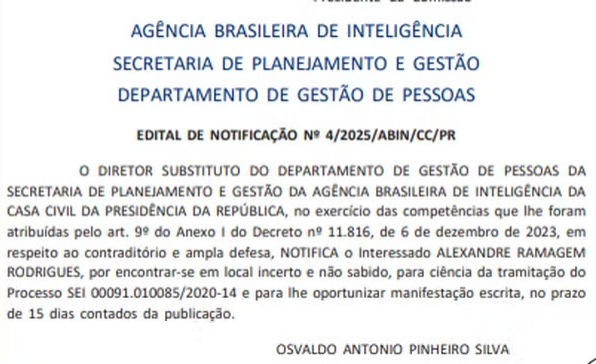 Na comunicação enviada, a Abin registrou que Ramagem está “em local incerto e não sabido”. Mesmo assim, abriu prazo de 15 dias para que ele apresente defesa ou se manifeste sobre o procedimento administrativo de devolução dos valores.