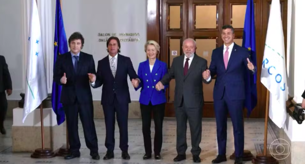 Acordo UE-Mercosul é celebrado por presidente da Comissão Europeia e presidentes do Brasil, Argentina, Uruguai e Paraguai. Foto: Imagem: TV Globo