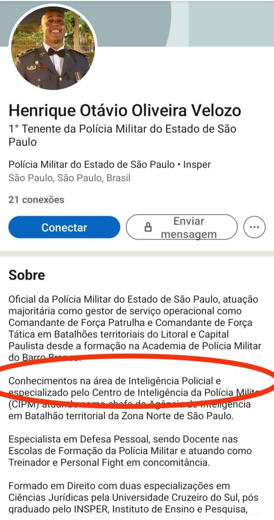 Também dizia ter “atuação majoritária como gestor de serviço operacional como Comandante de Força Patrulha e Comandante de Força Tática em Batalhões territoriais do Litoral e Capital Paulista desde a formação na Academia de Polícia Militar do Barro Branco e conhecimentos na área de Inteligência Policial e especializado pelo Centro de Inteligência da Polícia Militar (CIPM) atuando como chefe de Agência de Inteligência em Batalhão territorial da Zona Norte de São Paulo”.