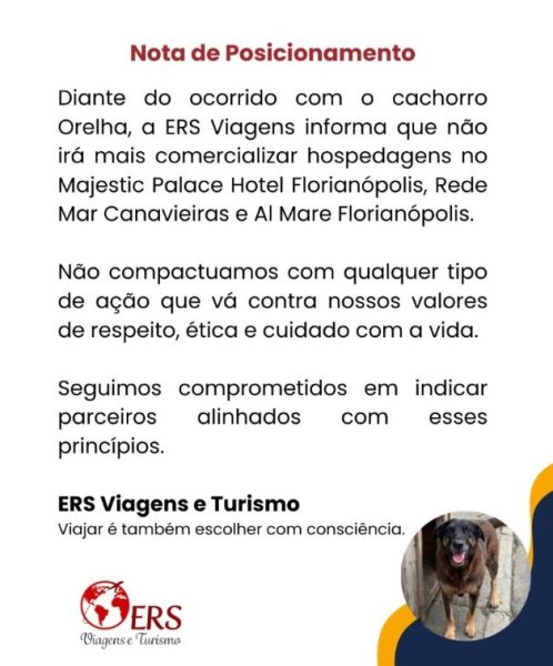 Em nota oficial, a agência afirmou: “Diante do ocorrido com o cachorro Orelha, a ERS Viagens informa que não irá mais comercializar hospedagens no Majestic Palace Hotel Florianópolis, Rede Mar Canavieiras e Al Mare Florianópolis. Não compactuamos com qualquer tipo de ação que vá contra nossos valores de respeito, ética e cuidado com a vida. Seguimos comprometidos em indicar parceiros alinhados com esses princípios”.