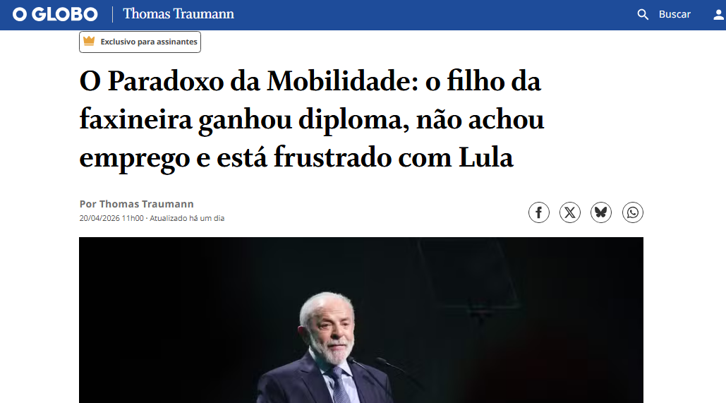 “O Paradoxo da Mobilidade: o filho da faxineira ganhou diploma, não achou emprego e está frustrado com Lula”.