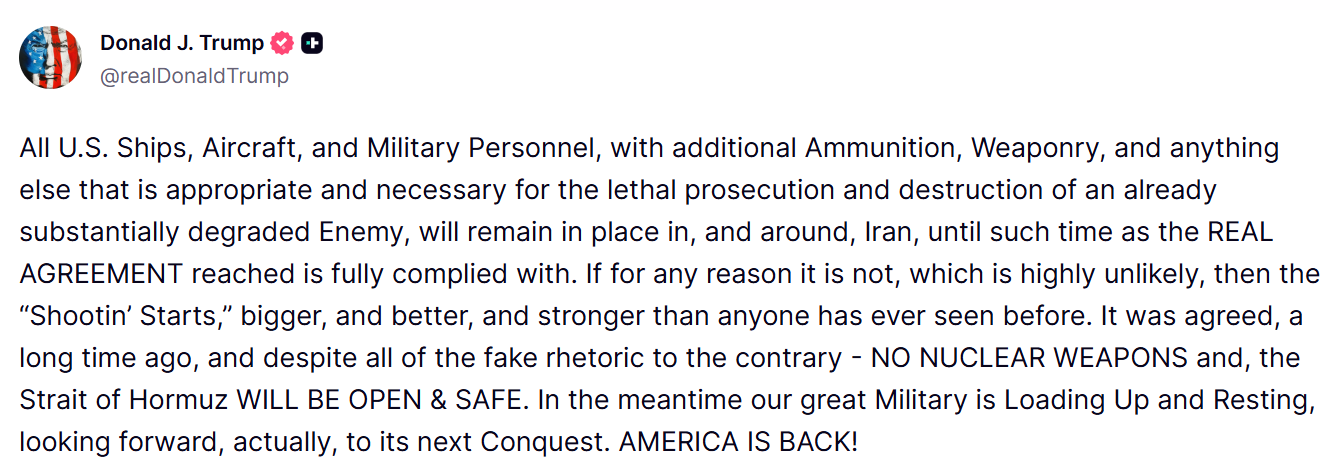 Em publicação na Truth Social, Trump afirmou que o aparato militar seguirá mobilizado no entorno iraniano. “Todos os navios, aeronaves e efetivos militares dos Estados Unidos, com munição adicional, armamento e qualquer outro elemento apropriado e necessário para a perseguição letal e destruição de um inimigo já substancialmente degradado, permanecerão em sua posição em e perto do Irã até o momento em que se cumpra plenamente o ACORDO REAL alcançado”, escreveu.