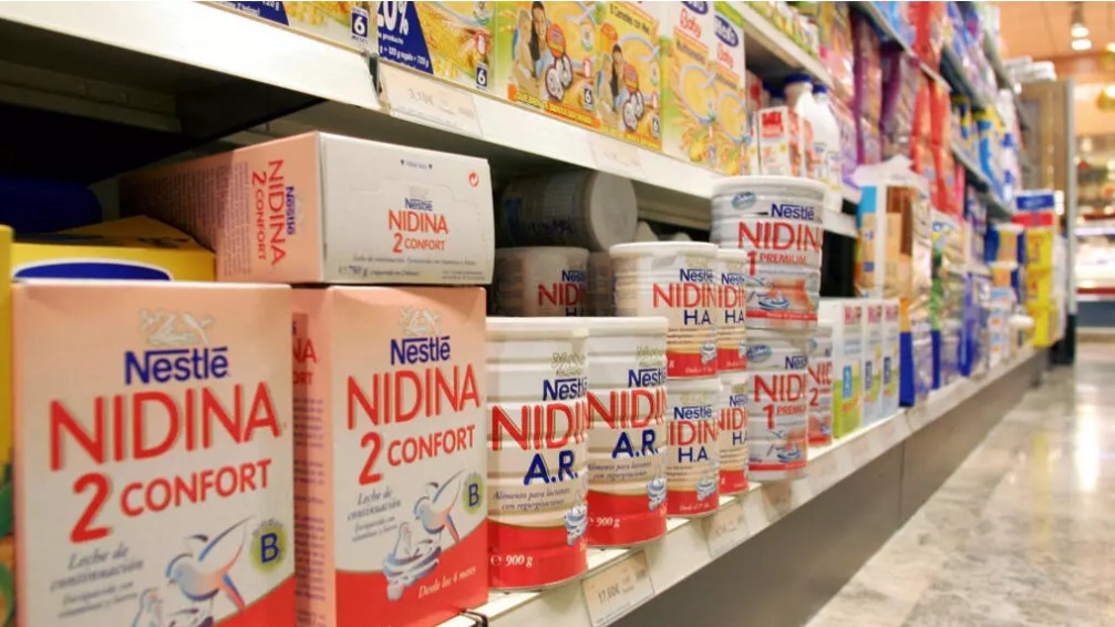 Prateleira de supermercado com latas e caixas de fórmulas infantis da marca Nestlé. Foto: Reprodução