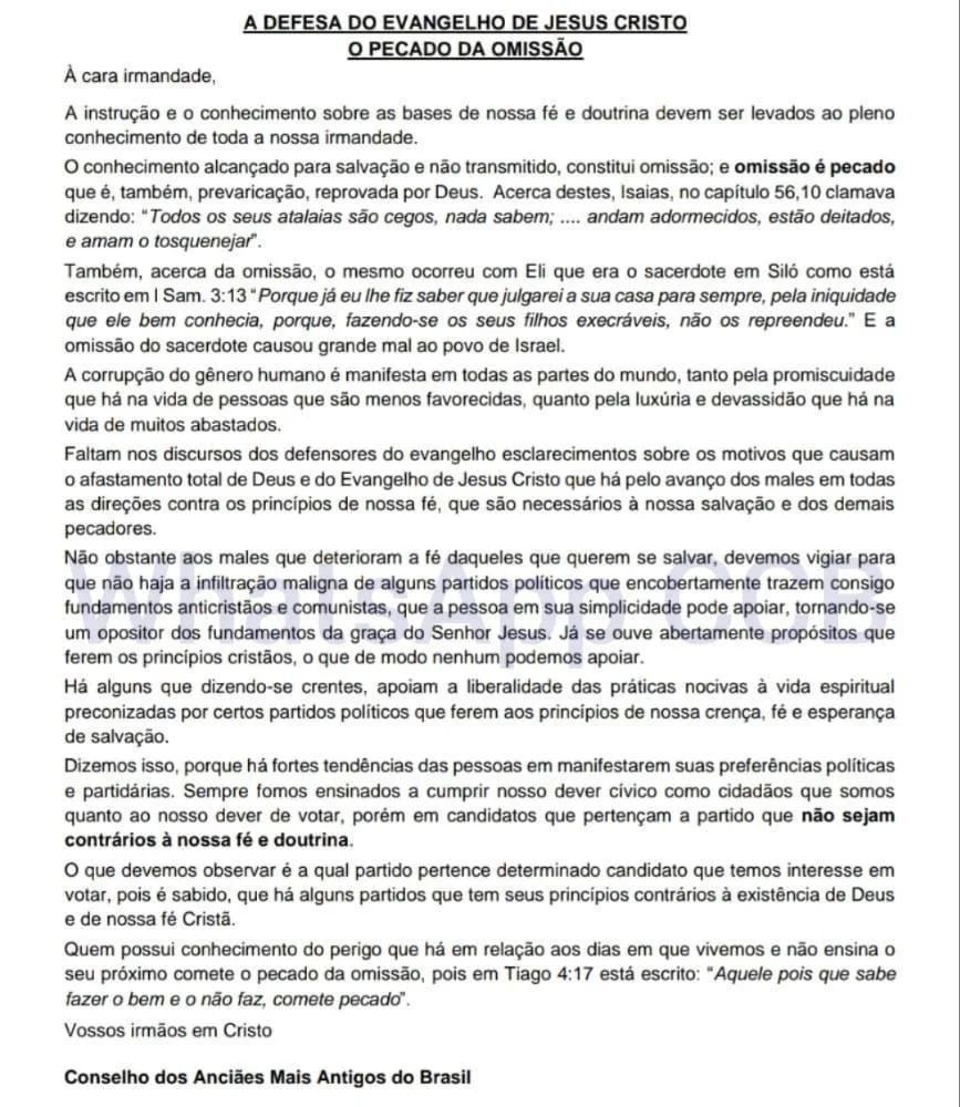 “De acordo com a lei, o voto é secreto e a escolha do candidato é livre, todavia o Ministério relembra à cara irmandade que, conforme ensinamentos antigos, não devemos votar em candidatos, nem em partidos, que neguem a existência de Deus e ou sejam contrários aos princípios e valores cristãos”.