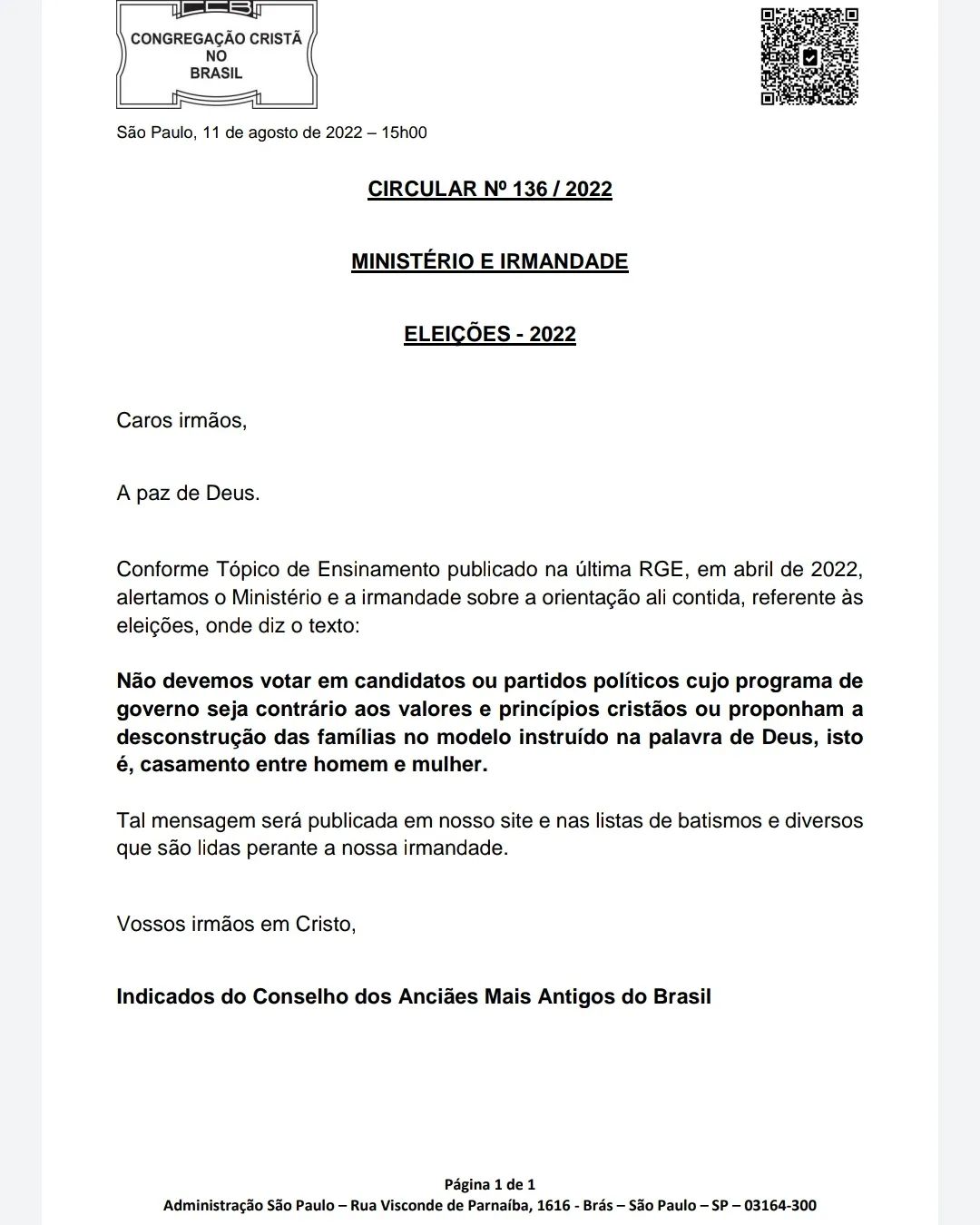 “De acordo com a lei, o voto é secreto e a escolha do candidato é livre, todavia o Ministério relembra à cara irmandade que, conforme ensinamentos antigos, não devemos votar em candidatos, nem em partidos, que neguem a existência de Deus e ou sejam contrários aos princípios e valores cristãos”.