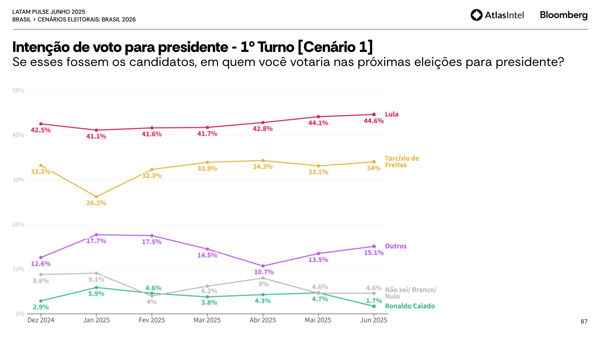 Em um cenário hipotético de primeiro turno para a eleição presidencial de 2026, com os mesmos candidatos da eleição de 2022, Lula mantém uma pequena vantagem sobre o inelegível Jair Bolsonaro, com uma margem de apenas 1,6%. Esse número é menor do que o registrado no mês anterior, quando a vantagem de Lula sobre Bolsonaro era de 2,8%.